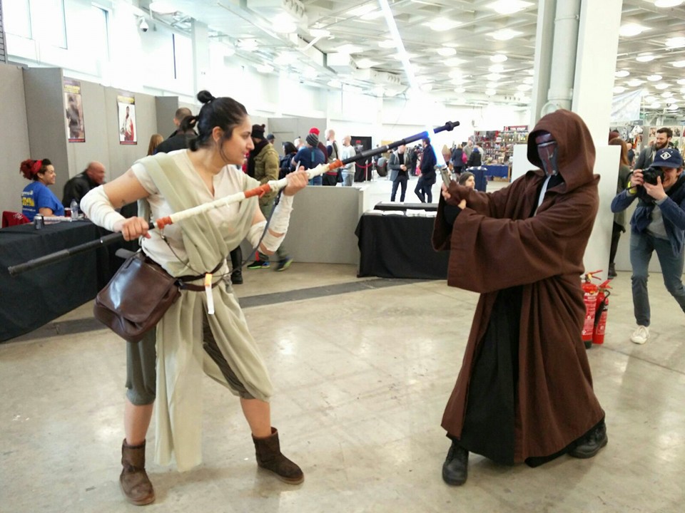 This was my first go at cosplay as well as attending a comic con back in 2016, so it was definitely the most exciting. Putting together the outfit was pretty straightforward, I found a number of cheap options for the harem style pants, t-shirt and shoes on ebay which I adapted slightly for the look using my painting and sewing skills. The arm bandages I created out of cut-up old vests dipped in tea to give them that desert-worn effect, and I bought some indian chunni fabric for the drapes over the body. Making Rey’s staff was my favourite part and was so much fun. I am one of those people who like to hoard a lot of random objects in case I might need them for ‘something important’. Well it turns out that old curtain rail and discarded plumbing I kept aside finally came in useful! By some stroke of luck, they all pretty much fit together, and where they didn’t I added a few strategic cuts and licks of paint. I then used the same material from my arm bandages to wrap around the staff. The absolute cherry on top though, was I had kept this old handbag, the strap of which hooked perfectly onto the staff, thus completing the whole look.
